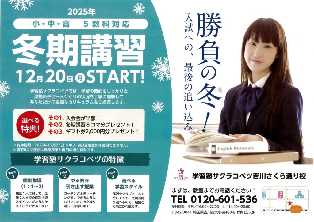 2学期も終盤。期末テストの結果が返ってきている時期かと思います。学習塾サクラコベツでは、一足早く3年生になる前から勉強習慣をつけたい!期末テストの成績がイマイチだった…。という生徒様に向けて冬入会特典をご用意しました。