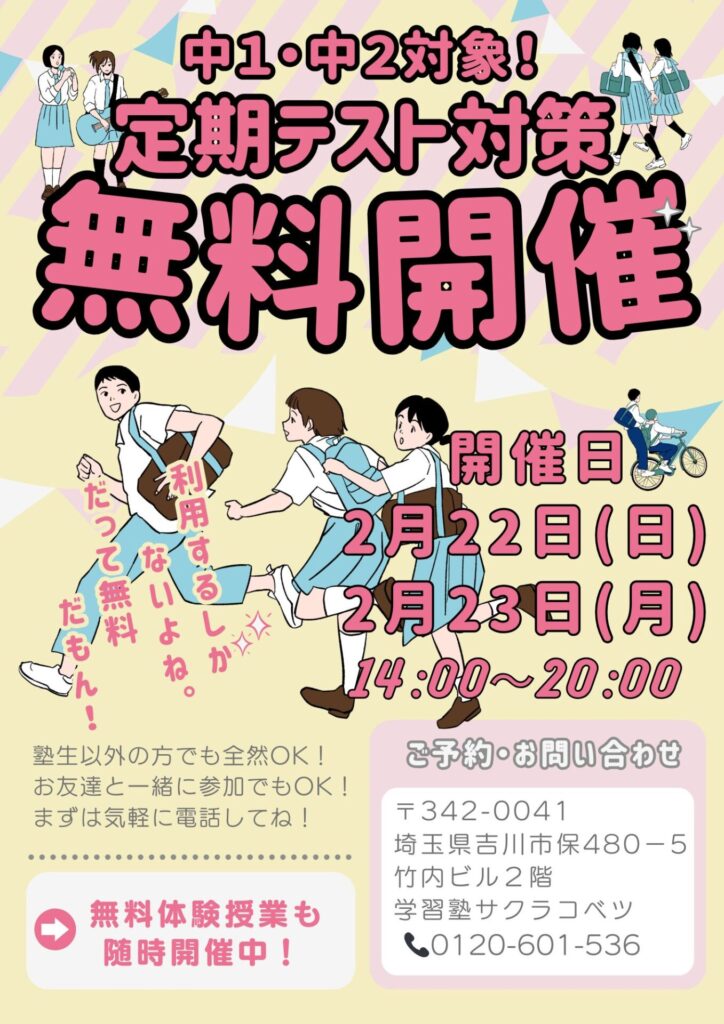 なんて中学生のみなさんに無料の定期テスト勉強会を22日(日)14:00~20:00、23日(祝)14:00~20:00に行います。サクラコベツに通っていない生徒様の参加もOKです。