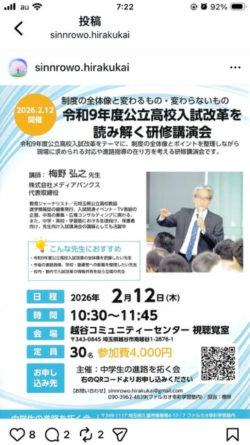 吉川市さくら通りの学習塾サクラコベツです。 先日、越谷サンシティで開催された「令和9年度公立高校入試改革を読み解く研修講演会」に参加させていただきました。